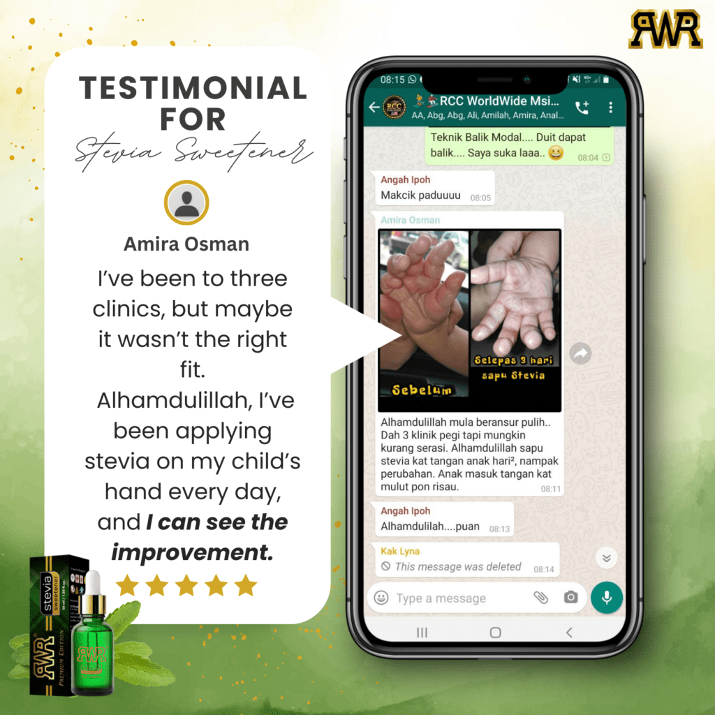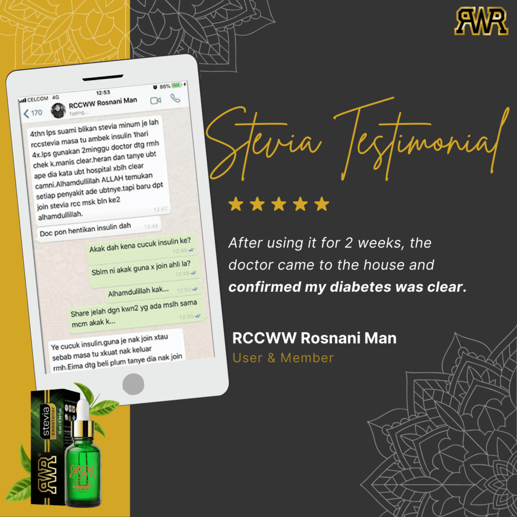 Penghidap diabetes boleh menggunakan RCC Worldwide Stevia Sweetener kerana ia memberikan rasa manis sambil mengekalkan kestabilan gula darah mereka supaya mereka boleh menikmati makanan tanpa risiko kesihatan. [Rujukan]